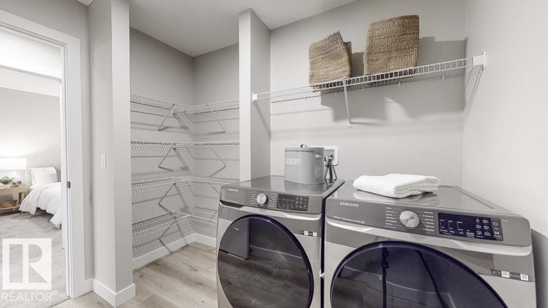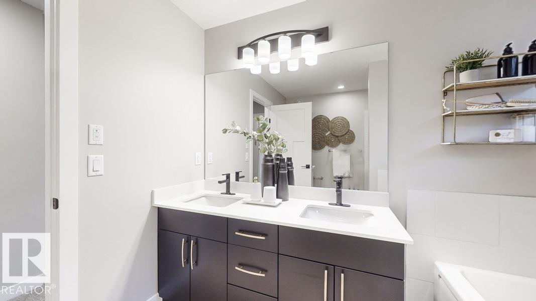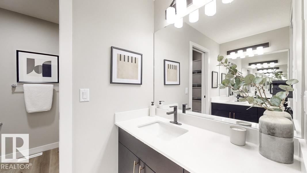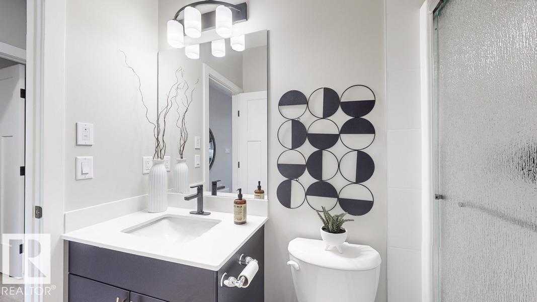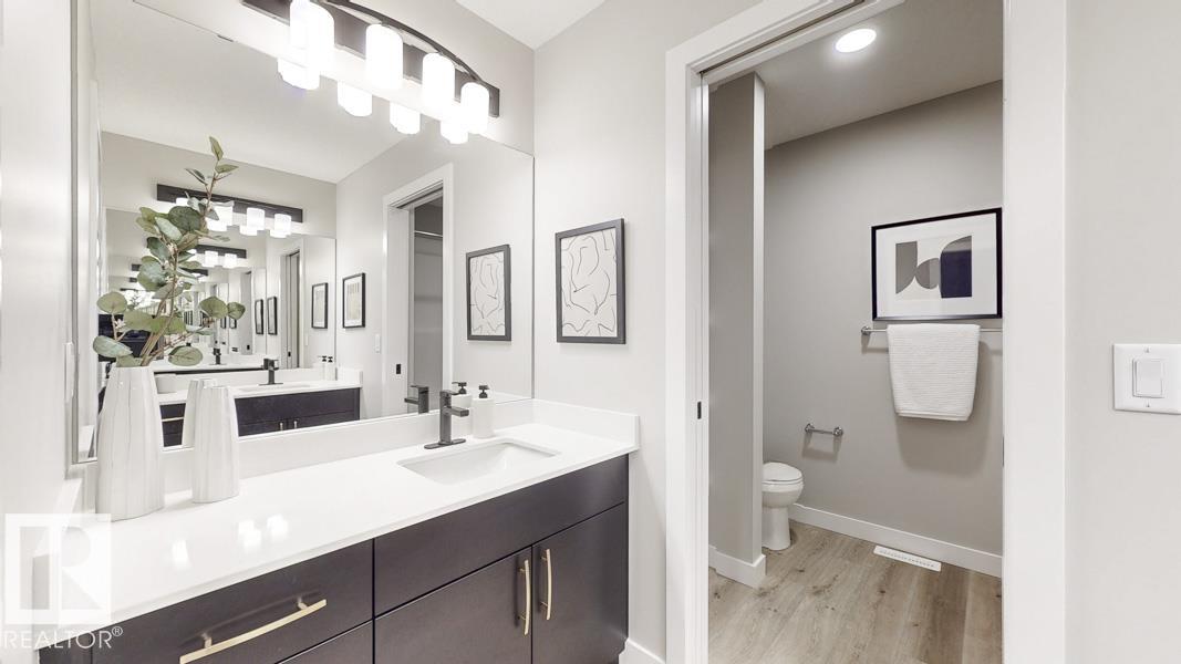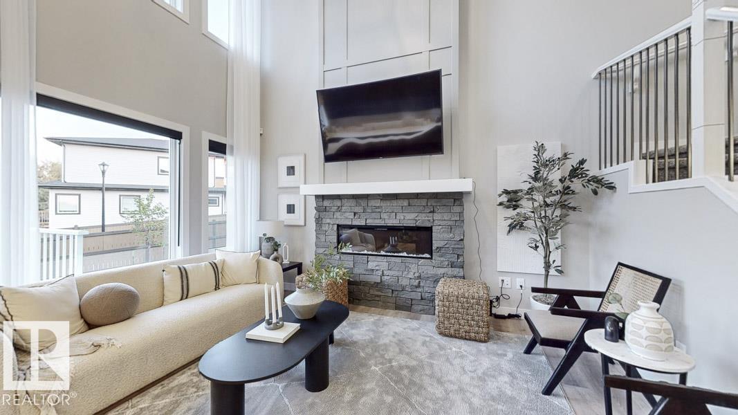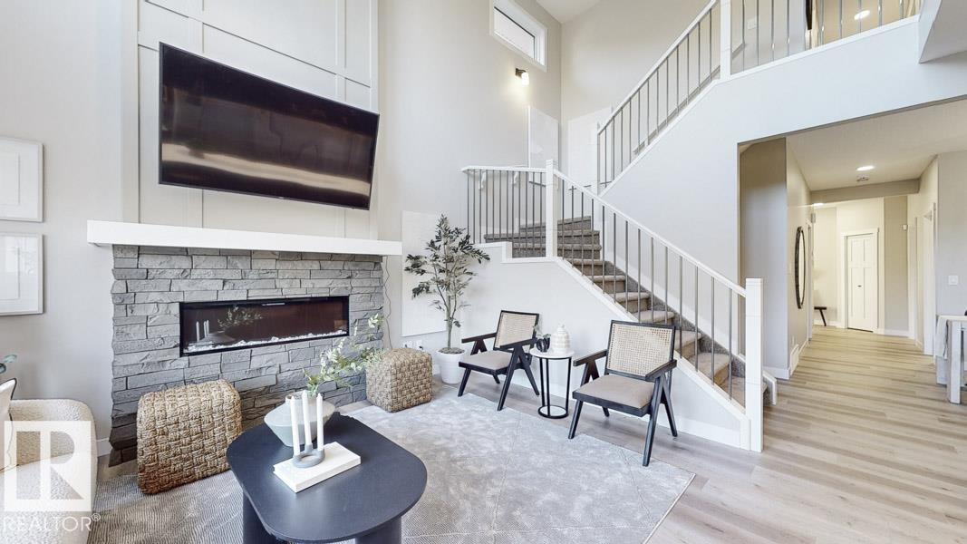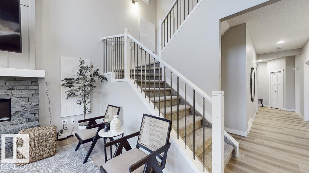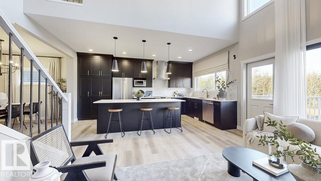 Built by Sterling Homes, this 2,211 sq ft home features a double attached garage with floor drain, 9-ft ceilings on the main and lower floors, side entrance, and luxury vinyl plank flooring on the main and upper levels. The foyer with coat closet opens to a mudroom off the garage, a full 3-pc bath with walk-in shower, and a main-floor bedroom or den?ideal for guests or a home office. A formal dining room sits separate from the open great room and kitchen. The kitchen offers quartz countertops, an island with a flush eating ledge and waterfall edge, a Silgranit sink, a built-in microwave, pendant lighting, chimney hood, full-height backsplash, soft-close cabinets with raised doors, and a pantry. The great room features a fireplace, large windows, 17-ft open-to-above ceiling, and a garden door to the deck. Upstairs includes a primary suite with a walk-in closet and a 5-pc ensuite, bonus room, a laundry with cabinets, two additional bedrooms, and a full bath. Basement rough-ins included.