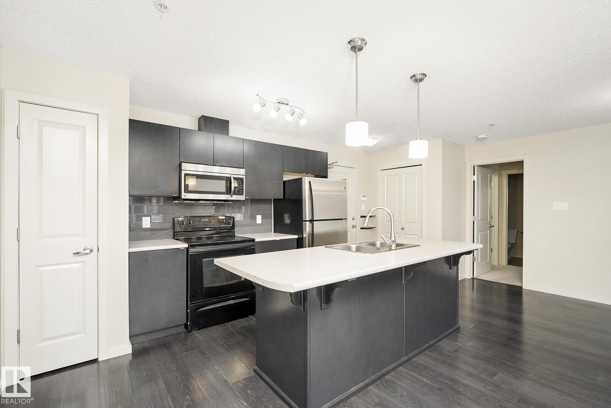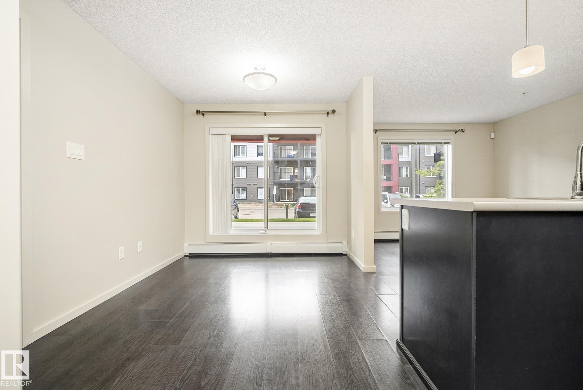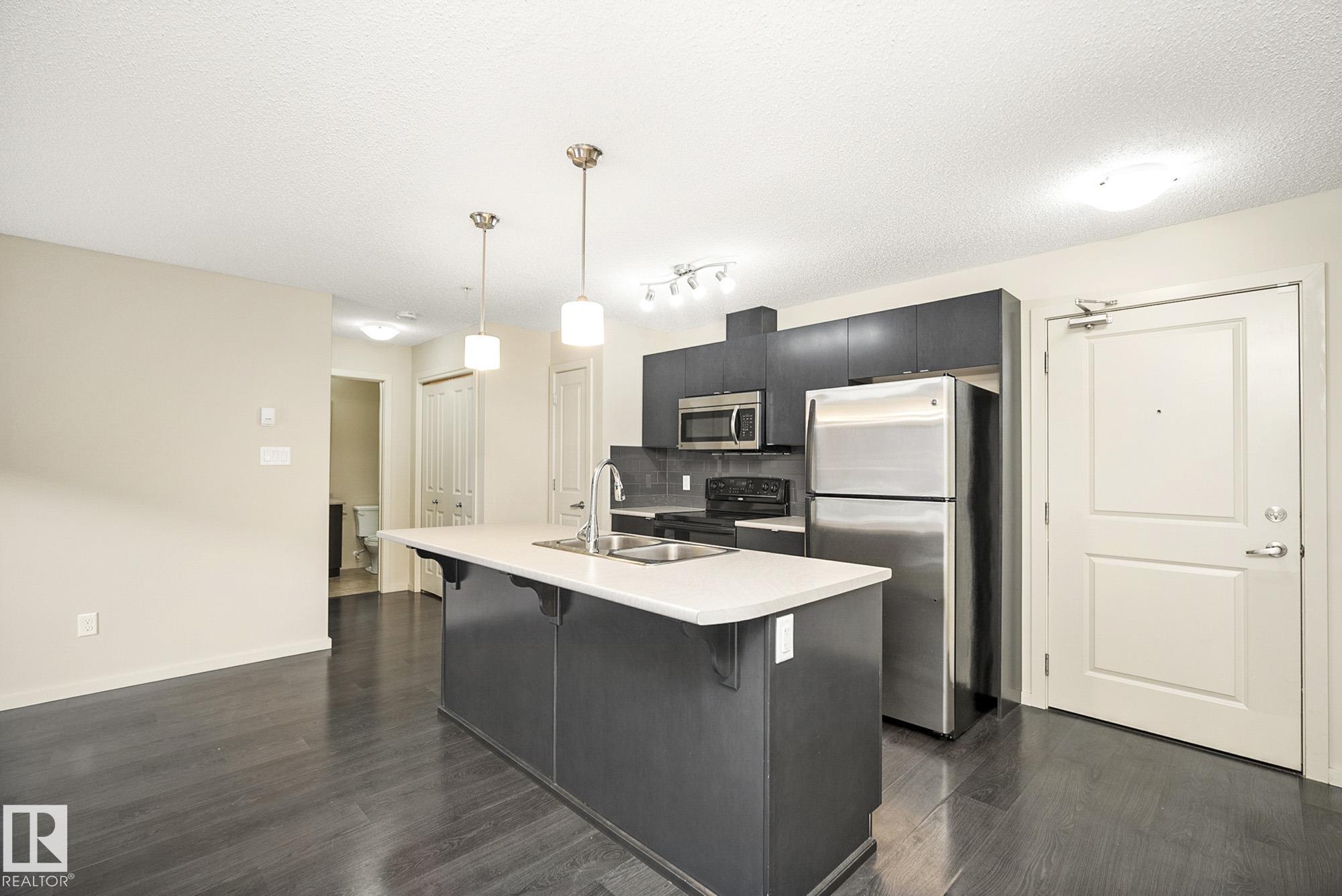 Welcome to Elements at Windermere! This trendy main-floor condo offers nearly 800 sq. ft. of well-designed living space with 2 bedrooms and 2 full bathrooms. The primary bedroom features a 4-piece ensuite and a spacious closet, while the smart layout ensures privacy between bedrooms along with separate living and dining areas. The gourmet kitchen includes stainless steel appliances, a gloss-tile backsplash, and ample cabinet and counter space. Laminate flooring flows throughout the main living areas, and the bright living room is filled with natural light from the walk-out patio door. Additional features include in-suite laundry, low-E argon gas-filled windows, pressurized and air-conditioned corridors, and a video camera entrance system. This unit comes with two titled parking stalls (one underground and one surface). Ideally located in the heart of Windermere, just steps from schools, shopping, recreation centre, walking paths, and ponds. A great opportunity for first-time buyers or investors!