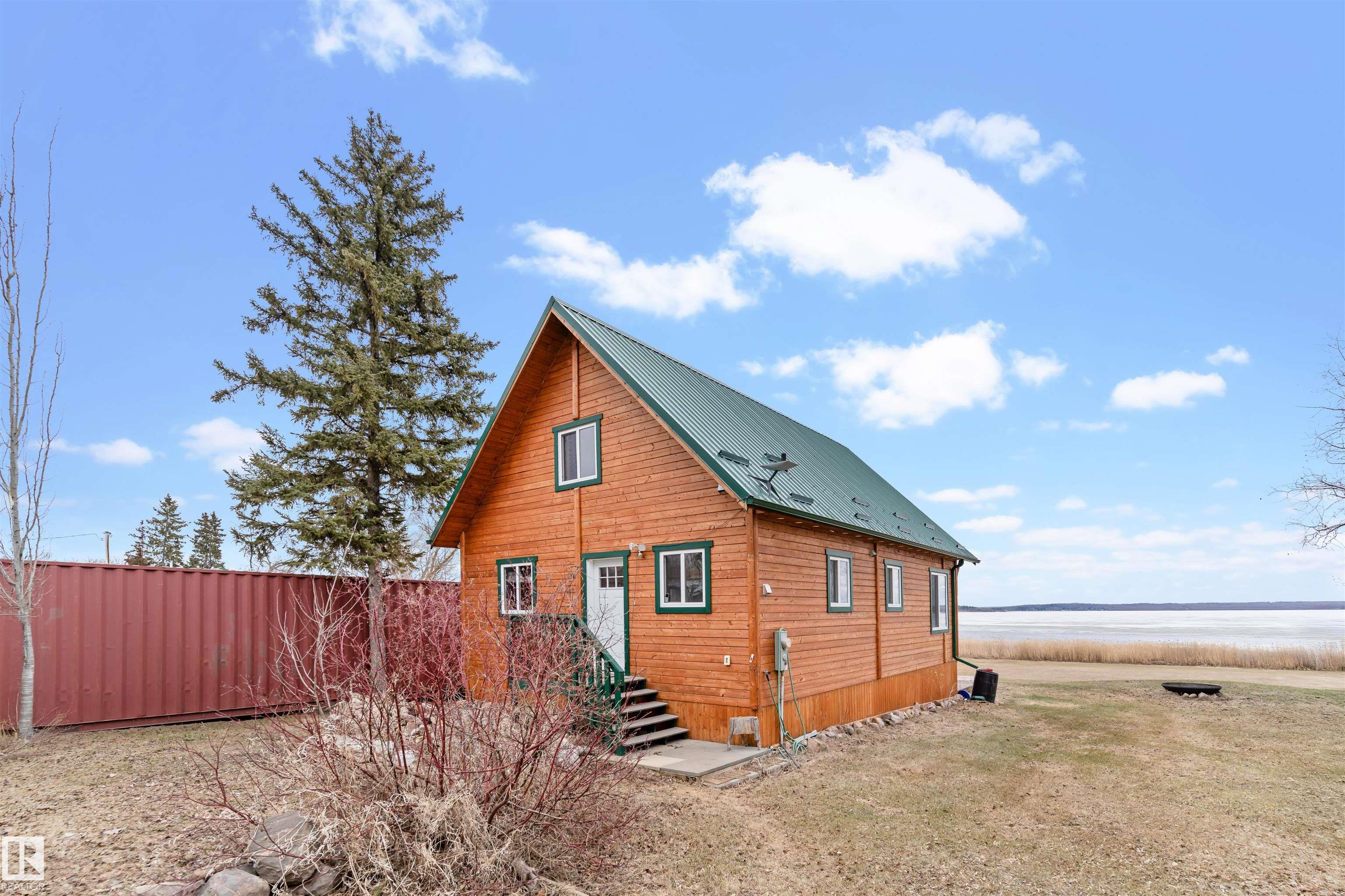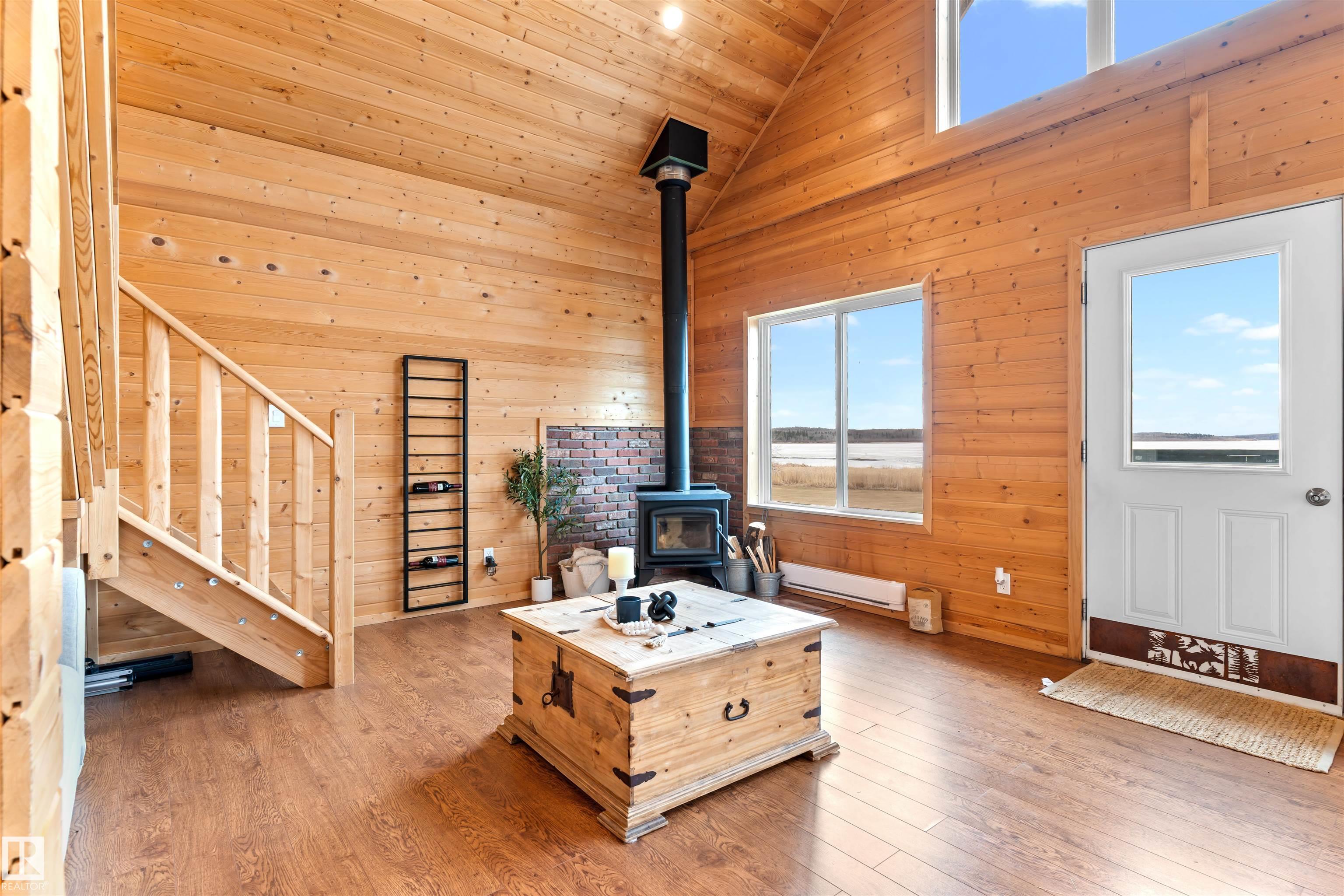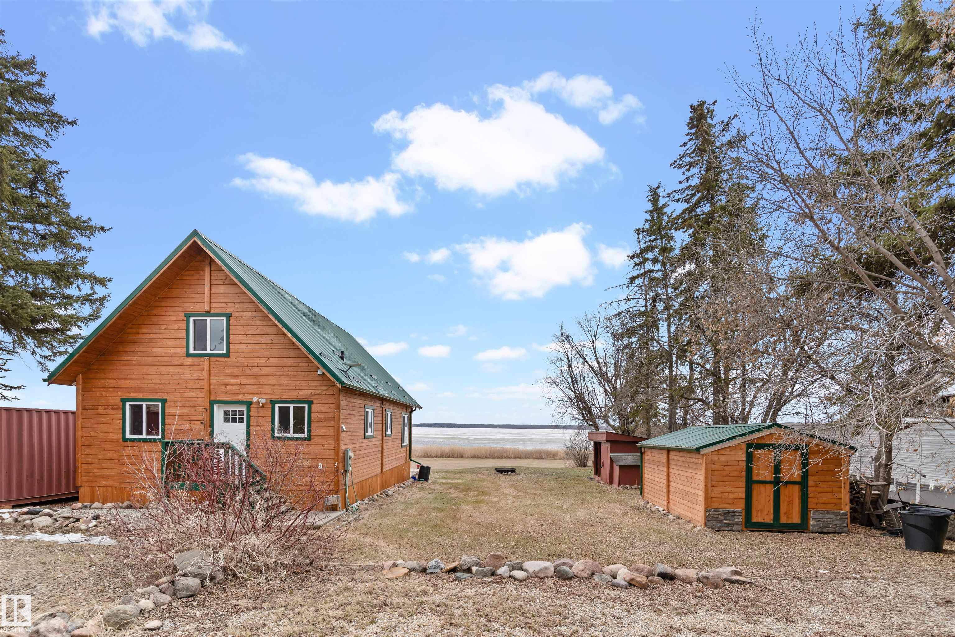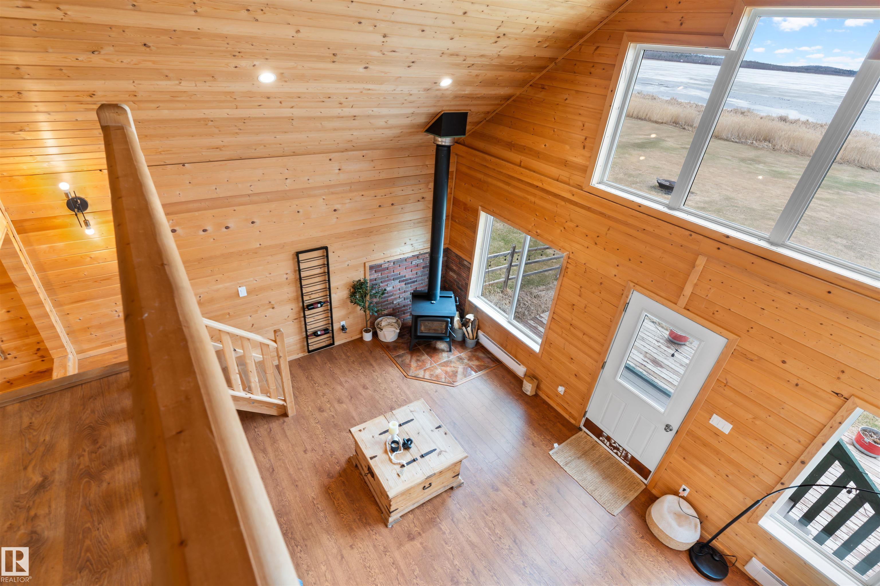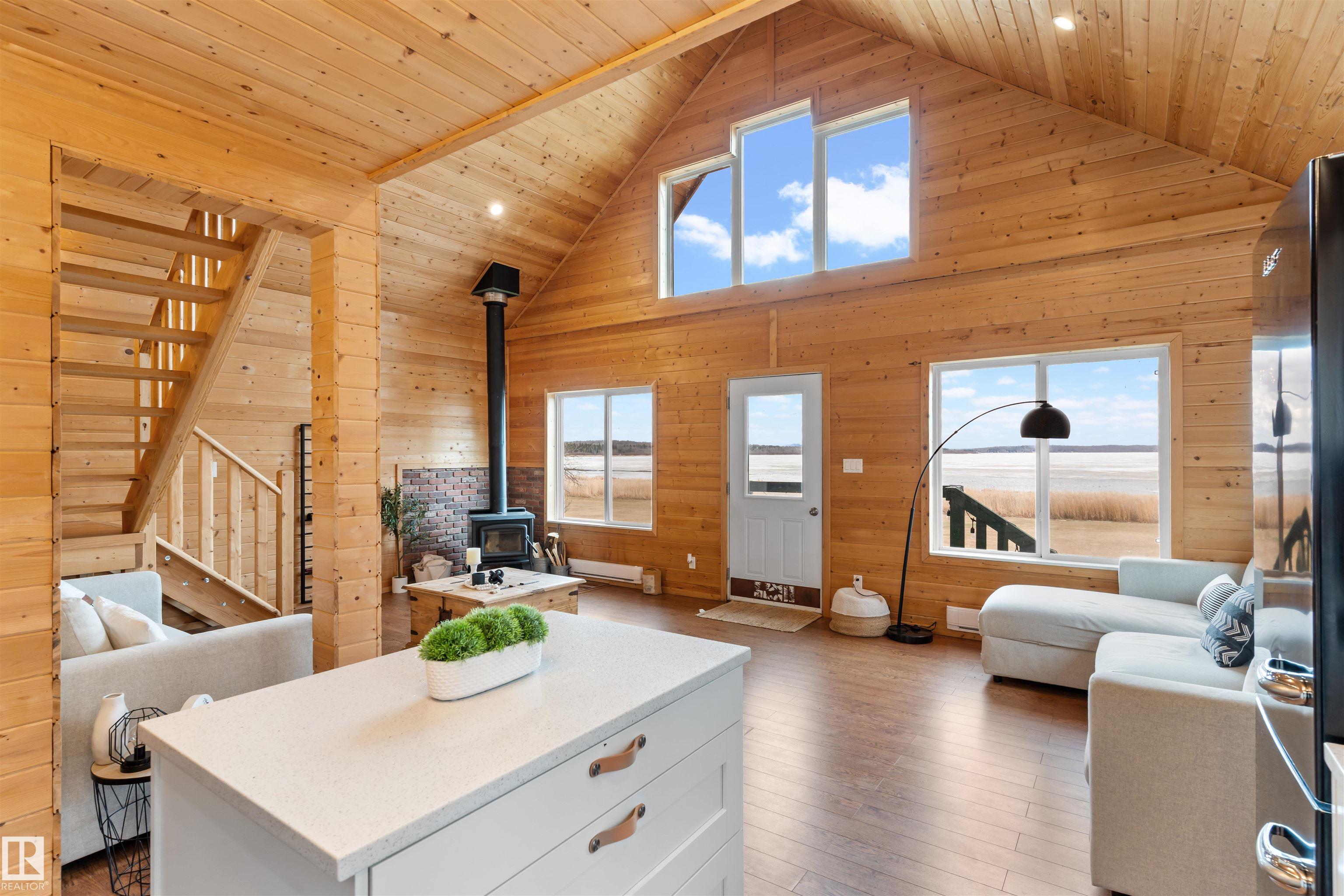 Never-ending memories will be created here at this Lakefront home on Sandy Lake, located on the south shore. This custom chalet-style home sits on 2 Lots and offers direct lake access. With stunning west-facing views, and a peaceful setting just steps from the water. Built in 2016, the home features an 18-foot vaulted ceiling with an open-concept kitchen, dining, and living area designed to capture natural light and lake views. The main floor includes a bedroom, 1.5 bathrooms, and quality wood finishes throughout. A loft overlooks the living space and provides additional sleeping or lounge area. Enjoy a wood-burning stove, expansive windows, and a south-facing lakeside deck ideal for relaxing or entertaining. The treed lot balances privacy with open space, complete with firepit area and room for gatherings. Fully serviced with power, heat cistern, and a holding tank. A rare opportunity to own a turnkey waterfront retreat ideal for year-round use, recreation, or quiet escape.
