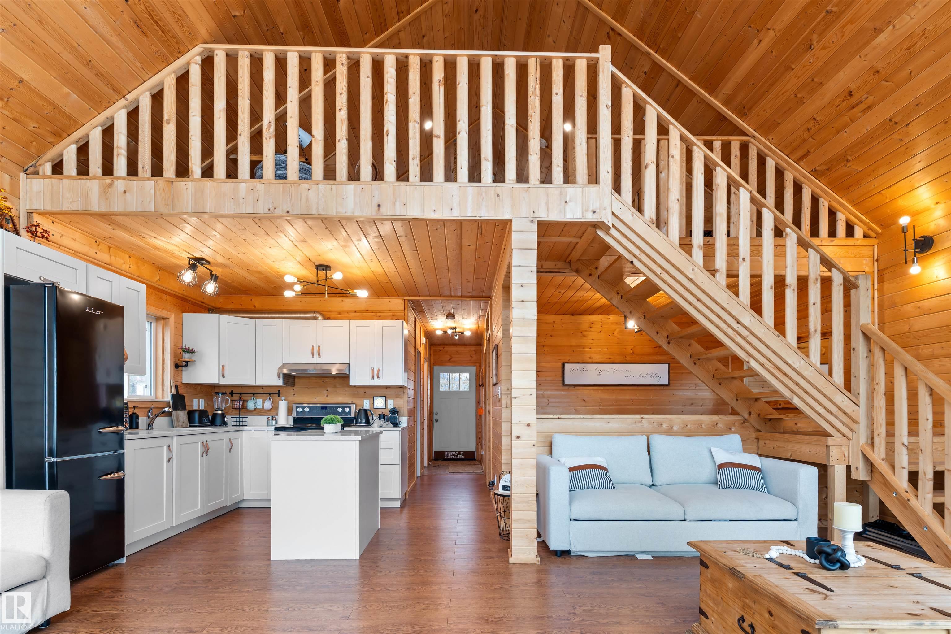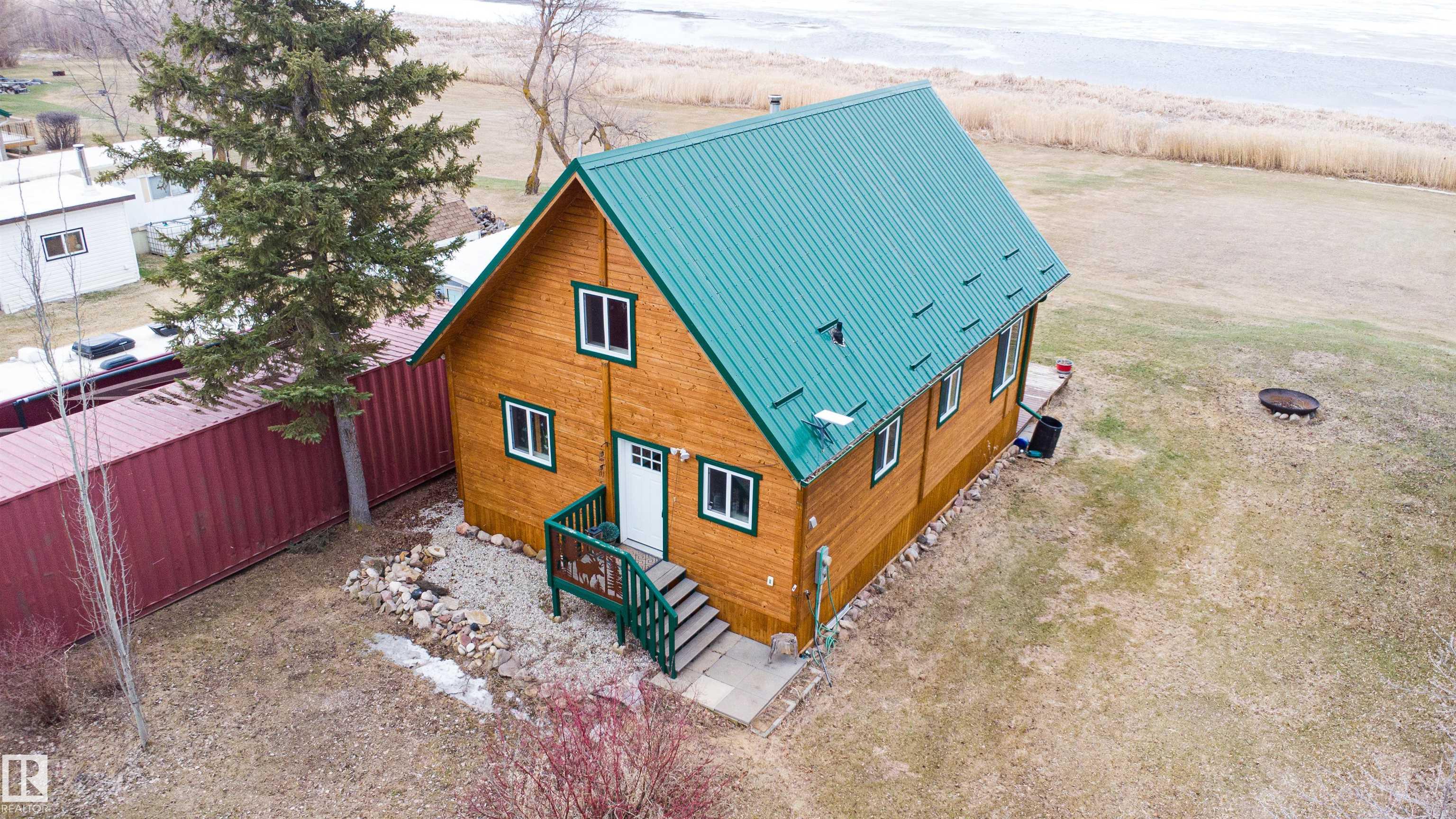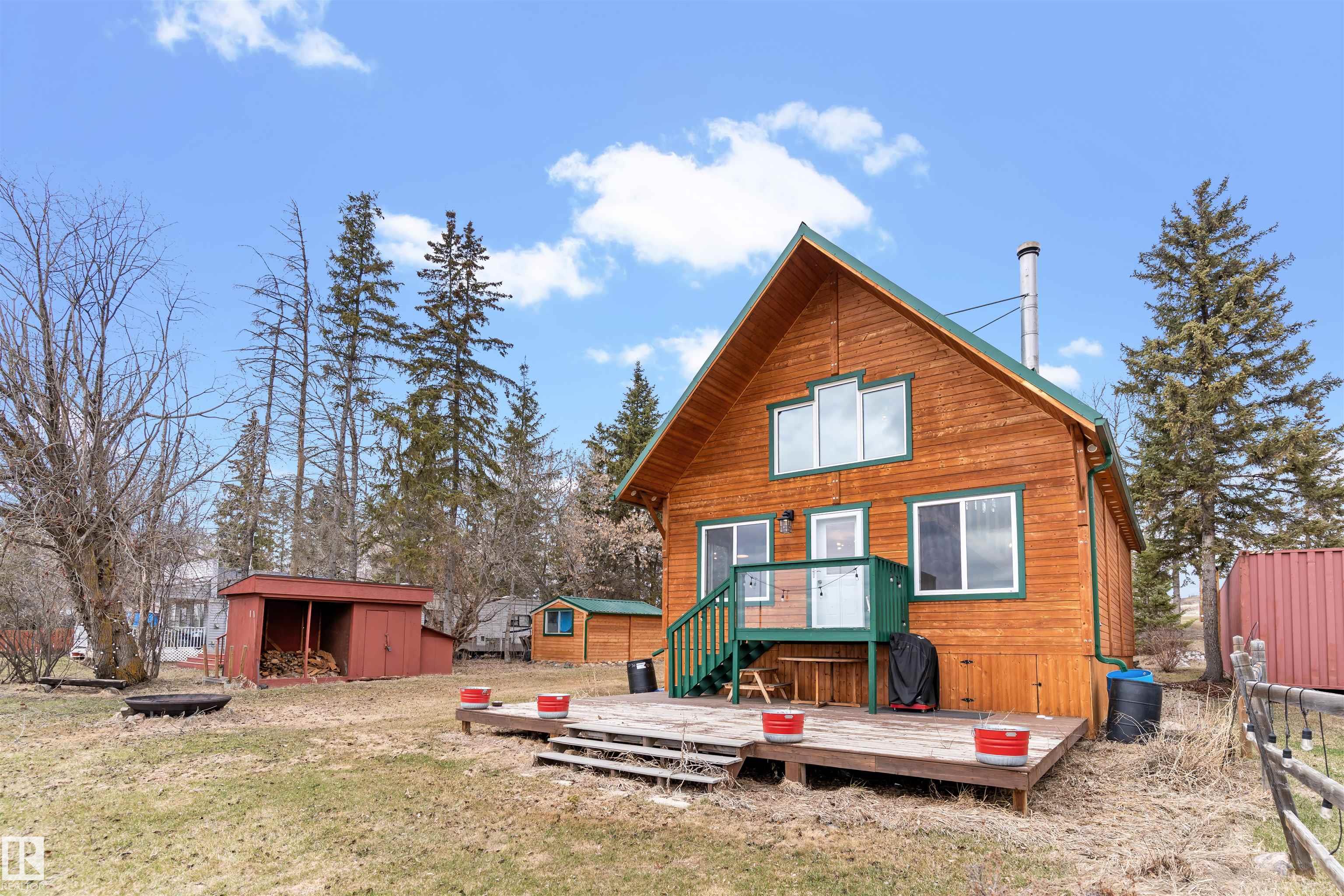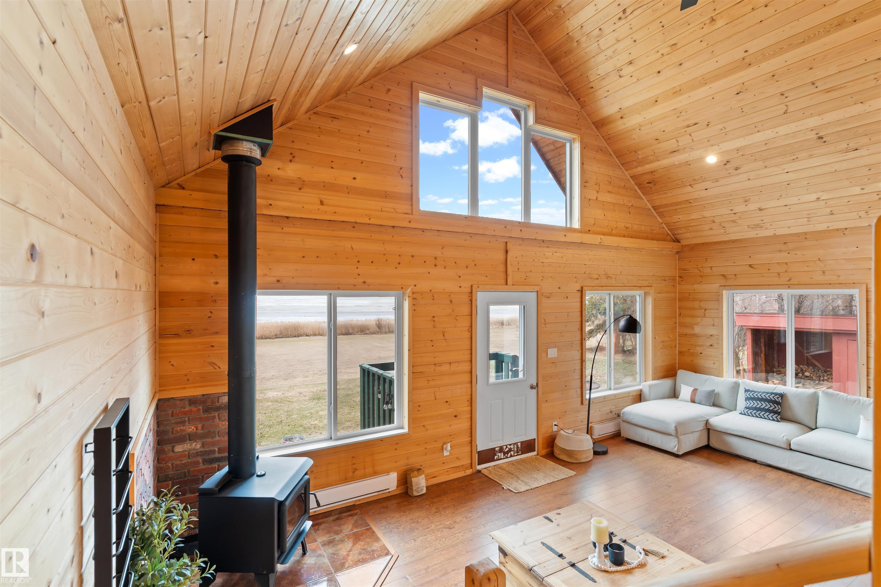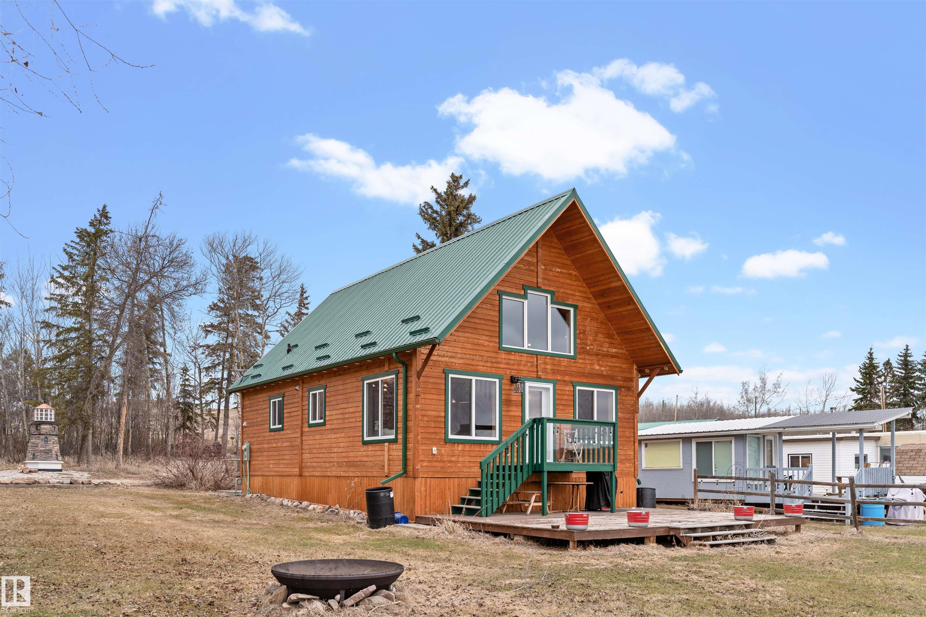 Never-ending memories will be created here at this Lakefront home on Sandy Lake, located on the south shore. This custom chalet-style home sits on 2 Lots and offers direct lake access. With stunning west-facing views, and a peaceful setting just steps from the water. Built in 2016, the home features an 18-foot vaulted ceiling with an open-concept kitchen, dining, and living area designed to capture natural light and lake views. The main floor includes a bedroom, 1.5 bathrooms, and quality wood finishes throughout. A loft overlooks the living space and provides additional sleeping or lounge area. Enjoy a wood-burning stove, expansive windows, and a south-facing lakeside deck ideal for relaxing or entertaining. The treed lot balances privacy with open space, complete with firepit area and room for gatherings. Fully serviced with power, heat cistern, and a holding tank. A rare opportunity to own a turnkey waterfront retreat ideal for year-round use, recreation, or quiet escape.
