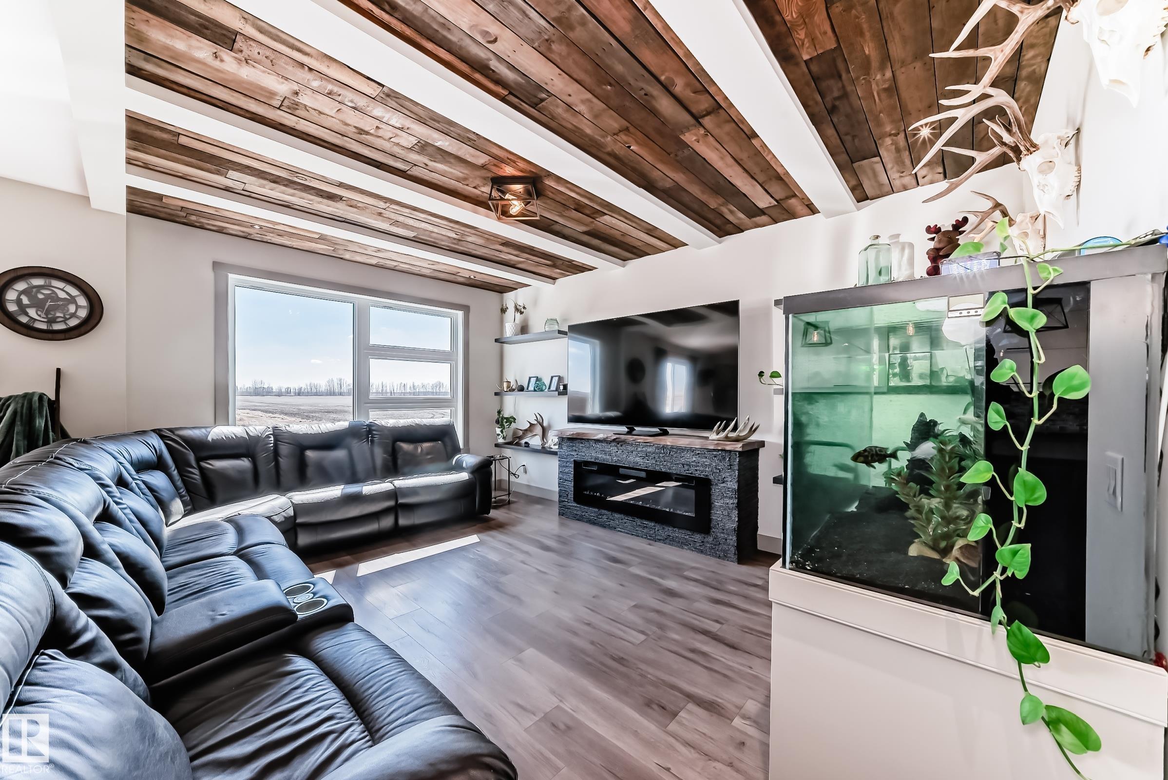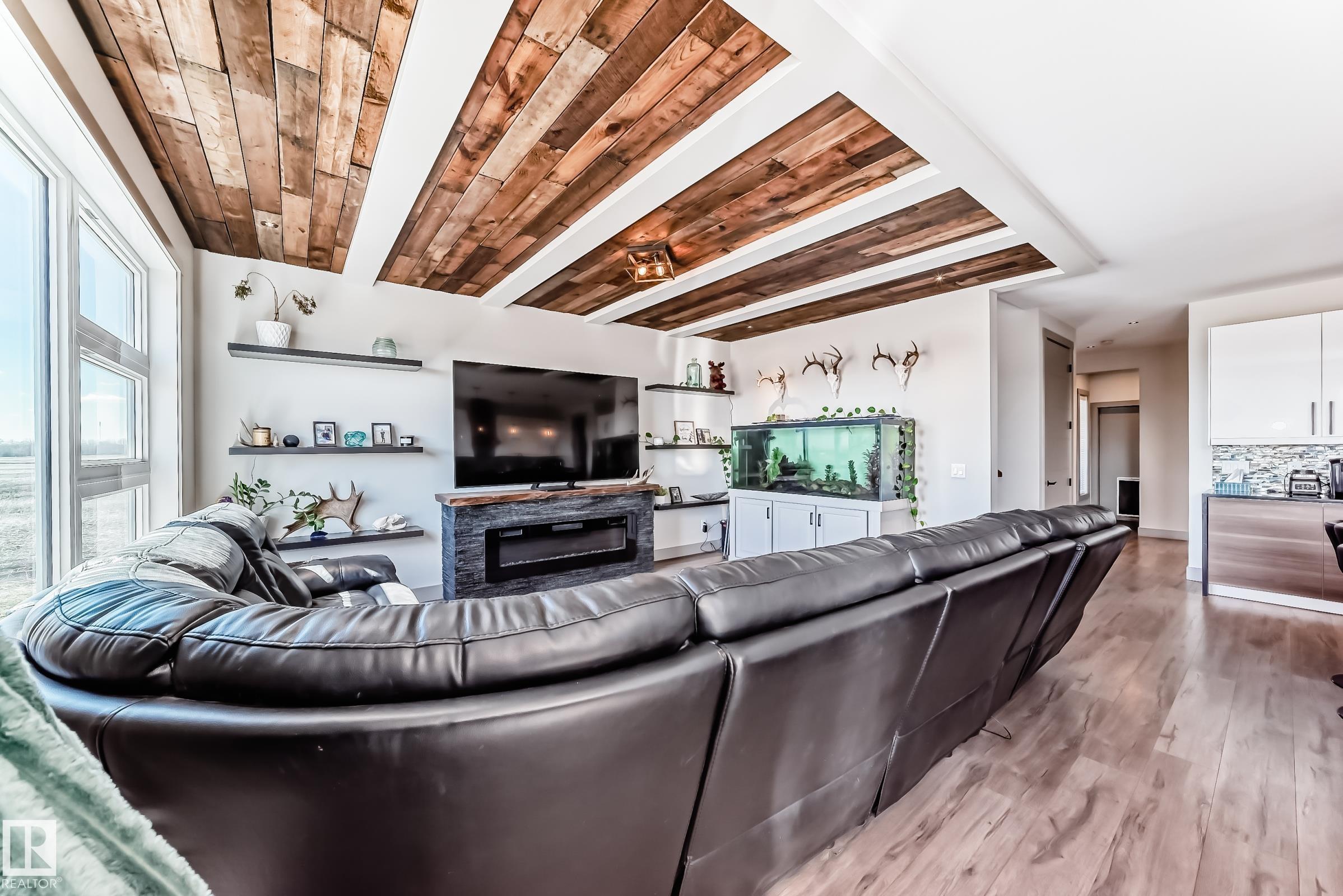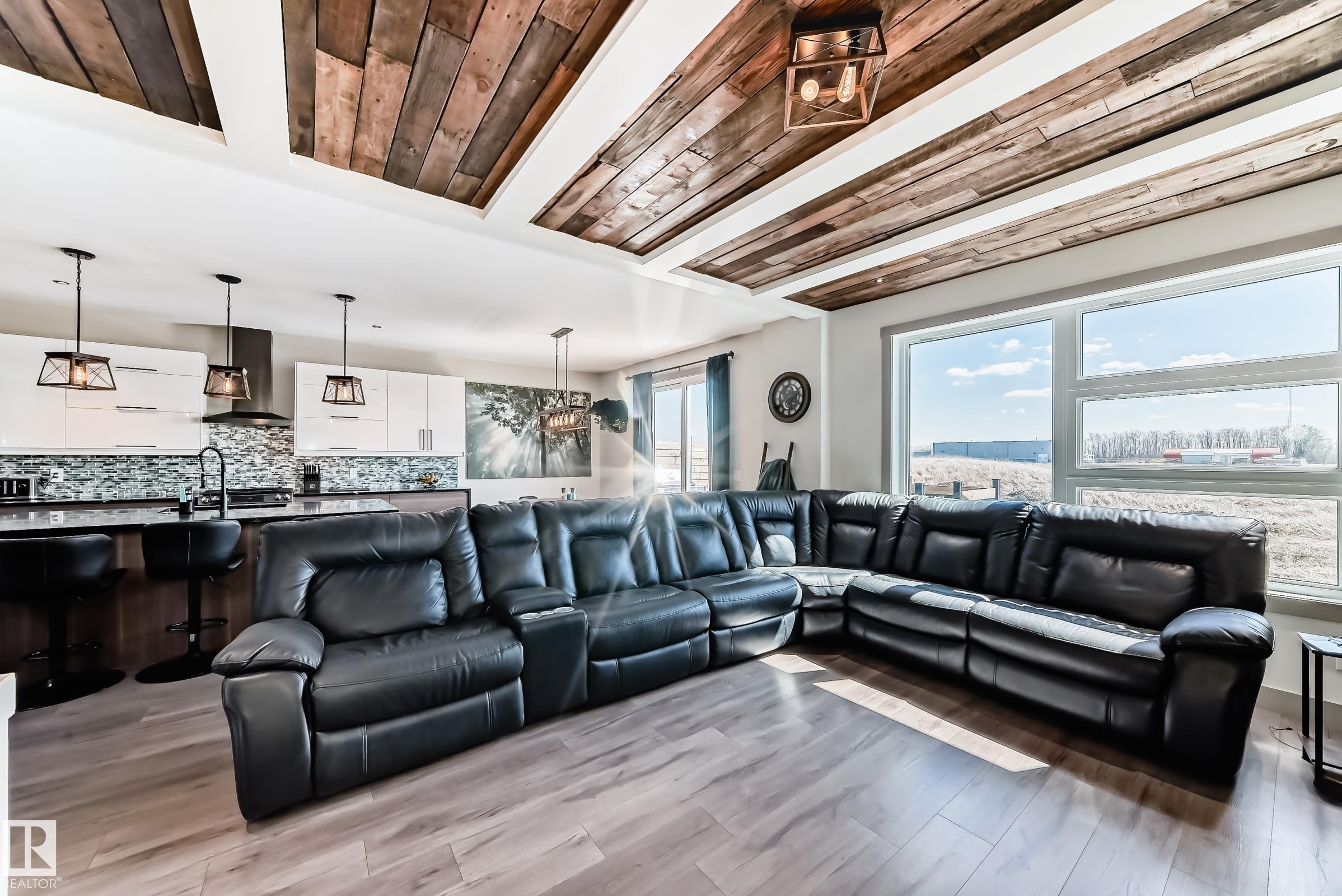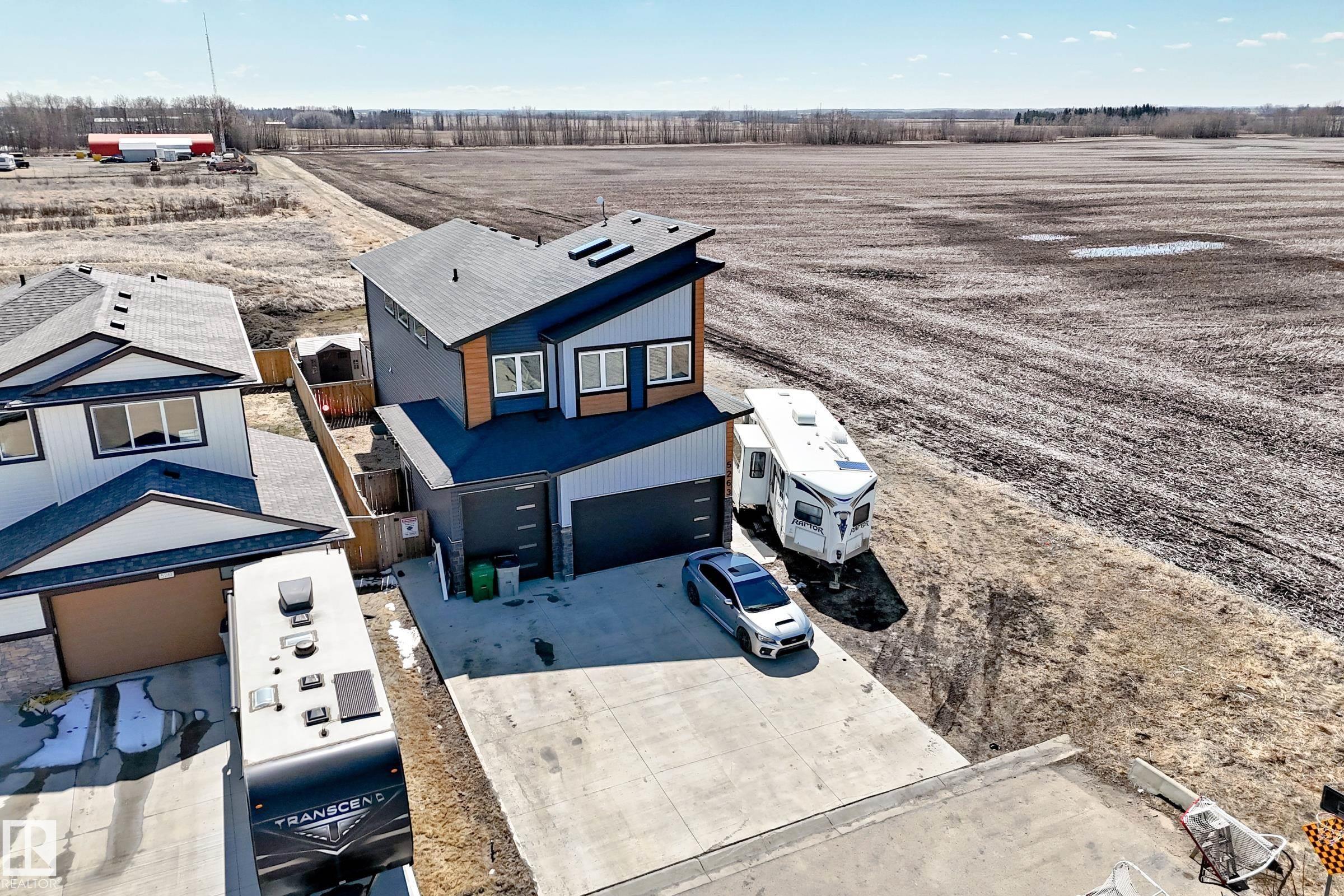 Discover executive luxury in this contemporary 2,646 sq ft masterpiece featuring 4+1 bedrooms, 4 full baths, a main-floor office and Central AC. The striking exterior boasts a triple car garage, RV parking and security system. The chef?s kitchen is a showstopper, anchored by a quartz waterfall island, premium cabinetry, water softener, gas stove, spacious countertops and a walk-in pantry. The "modern rustic" living area features reclaimed wood ceilings and an electric stone mantel fireplace, with large windows this cozy space gives endless field views. Retreat to the vaulted primary suite with skylights, a private fireplace and a spa ensuite featuring heated floors, dbl sink, a soaker tub, and a rain shower. For maximum versatility, the partially finished basement includes a separate entrance, 1 bed + 1 bath; ideal for a future suite. Outside, a designer deck with privacy slats offers the ultimate space to enjoy the Alberta prairies. This home seamlessly blends high-end finishes with rural living.
